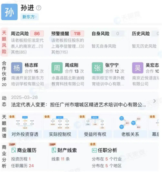 此外,天眼查信息顯示,孫進(jìn)在多家公司有任職,其中在多家新東方旗下子公司擔任法定代表人和董事長(cháng)。